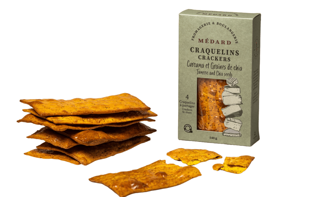 Avec son doux parfum de curcuma et sa teinte jaune soleil piquée de graines de chia, cette superbe tuile à craquer assure un coup d'éclat instantané à n'importe quel plateau de fromages.